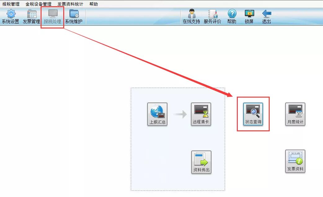 如果是航天信息的用户,点击“报税处理——金税设备状态查询”下的“增值税专用发票及增值税普通发票”栏来确认本月抄税清卡与否。
