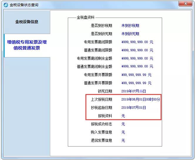 【报税处理】-【状态查询】-【监控管理信息】,查看开票截止日期为2019-07-15,即完成本月抄报税工作。