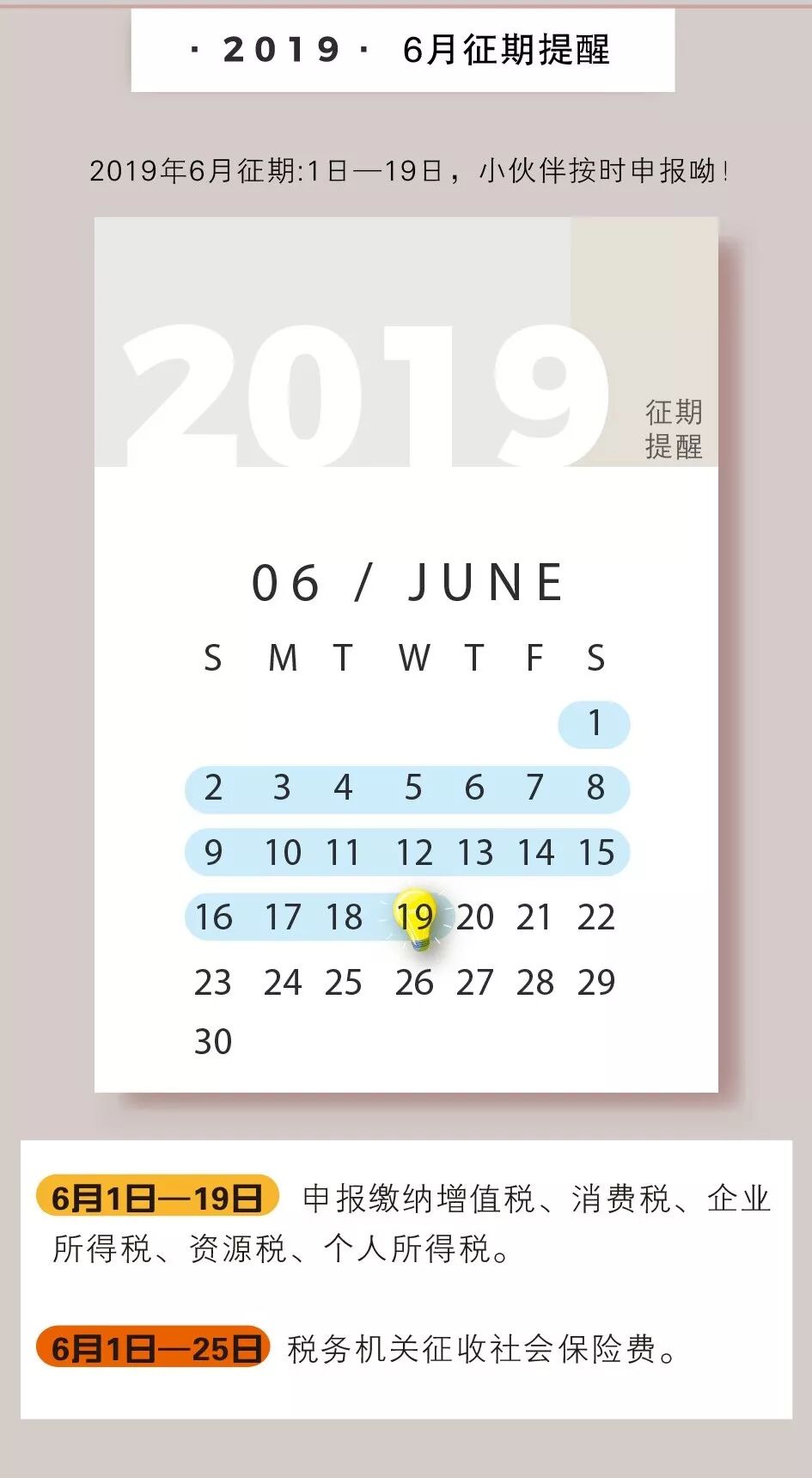 6月1日-19日申报缴纳增值税、消费税、城市维护建设税、教育费附加、地方教育附加、文化事业建设费、个人所得税、企业所得税、核定征收印花税