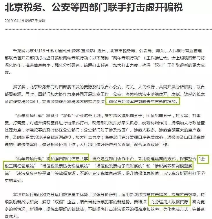会上明确四部门将深化协作,推进信息共享,强化分析研判,统筹打击任务,加大打击力度,2019年打击骗税虚开呈高压态势。财务和老板注意了!!!