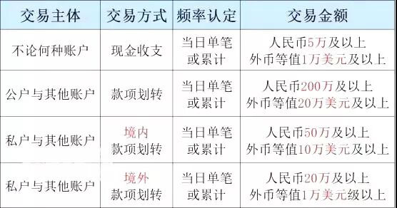 (一)当日单笔或者累计交易额人民币5万元以上(含5万元)、外币等值1万美元以上(含1万美元)的现金收支。