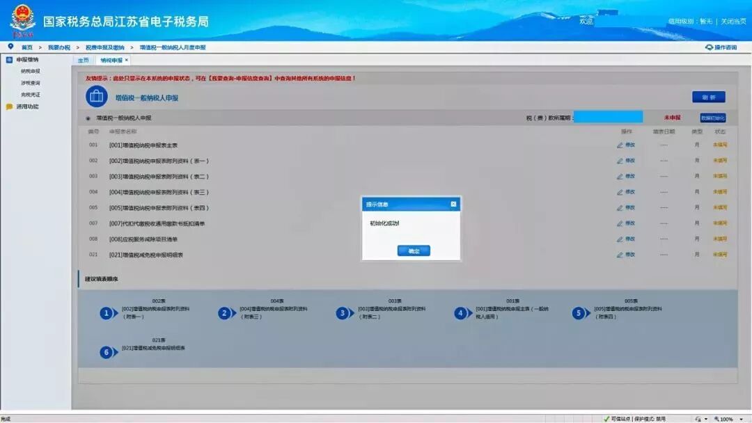 第三步:点击“数据初始化”-系统跳出相关提示,点击“是”—系统提示:“进项发票必须签名确认后方可进行申报。否则将导致申报失败!是否继续?”—点击“是”,系统显示:“初始化成功!”